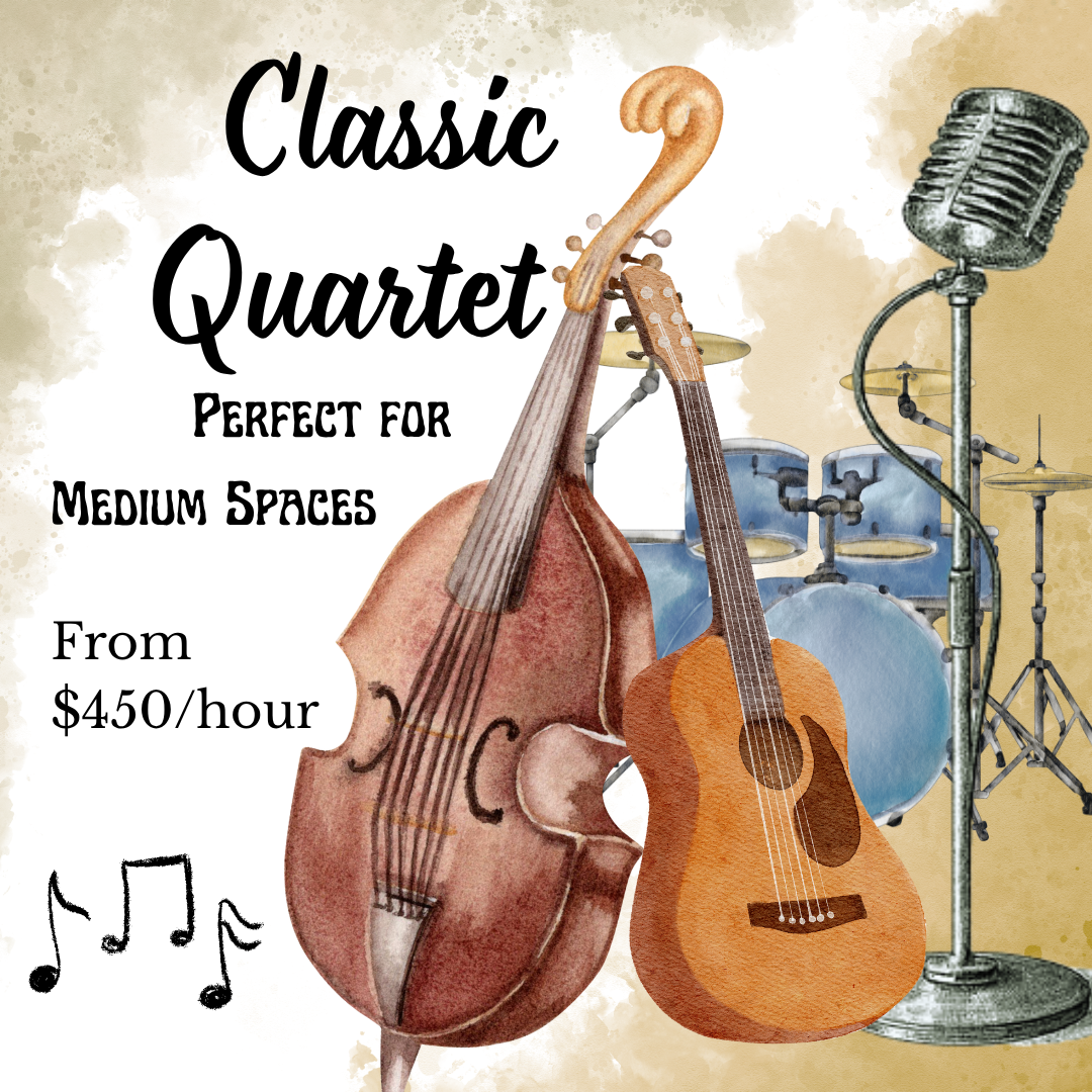 Elevate your space with a classic jazz quartet featuring a vocalist, guitarist, upright bassist, and drummer. Perfect for medium events and cocktail hours, our group brings a wide selection of jazz standards and vintage reimaginings of contemporary songs to every performance.